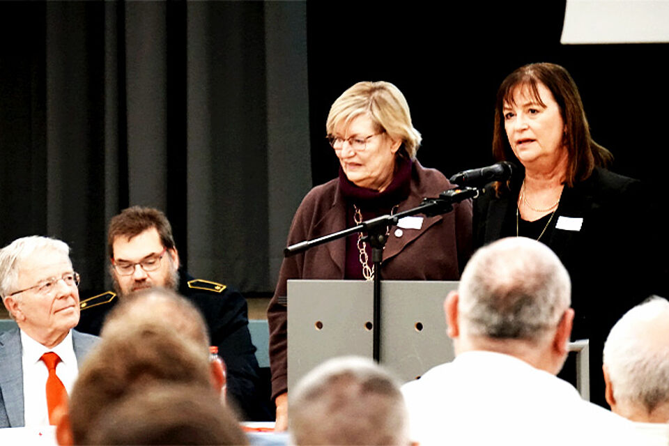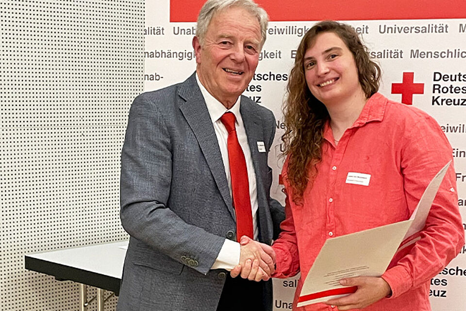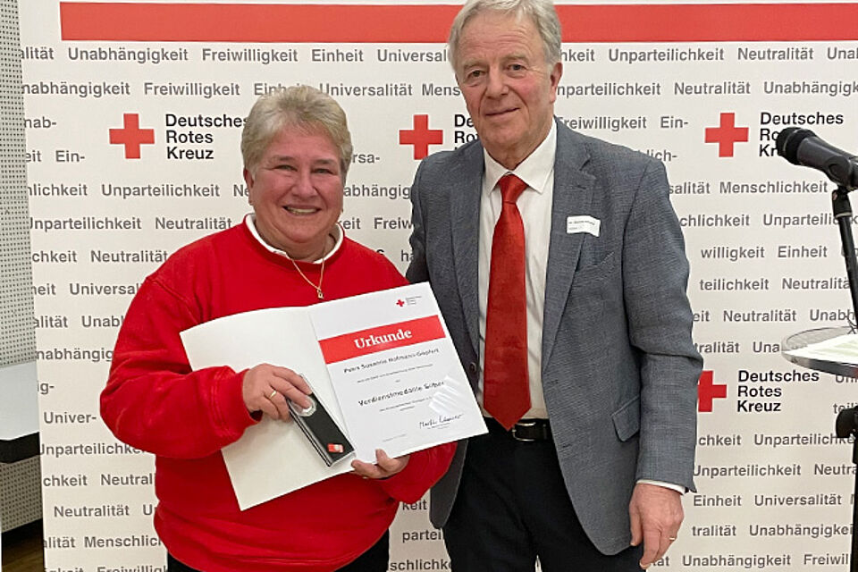 Äußerst erfreulich und von den Versammelten auch mit stehenden Ovationen gefeiert waren die Ehrungen extrem verdienter ehrenamtlicher Mitglieder: für Petra Hofmann-Göpfert (Jugendrotkreuz), Joshua Donalies (Bereitschaftsleiter Degerloch) und Roman Hasert (Bereitschaft Stuttgart-Ost) gab es jeweils die Verdienstmedaille und Bandschnalle Silber. Eine Ehrenmünze erhielt Laura von Baumbach von der Bereitschaft Stammheim.