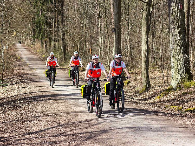 Im Juli 2021 gründete das Team Feuerbach/Botnang die Fahrradstaffel. Sie hat sich längst bewährt und kommt zum Beispiel bei Firmen- und Stadtläufen zum Einsatz. Mit acht E-Bikes sind die Einsatzkräfte schnell, flexibel und umweltfreundlich unterwegs.