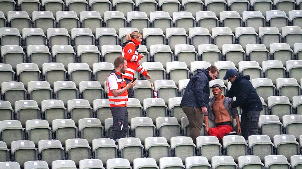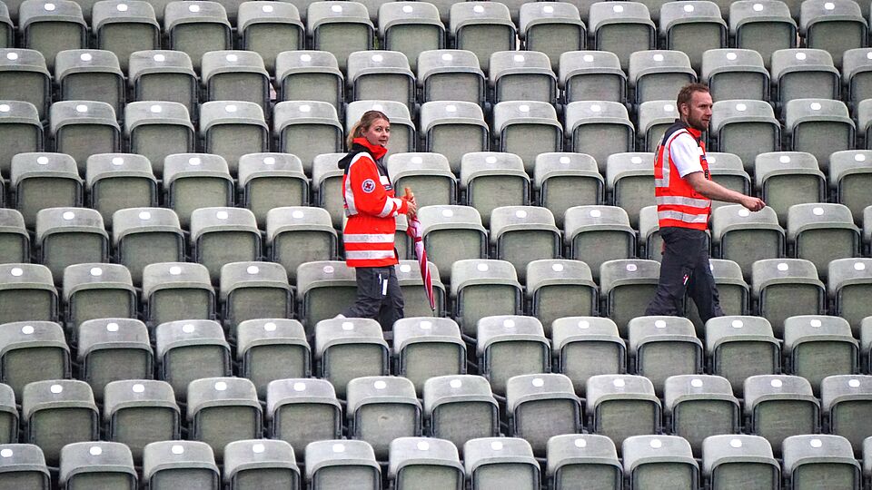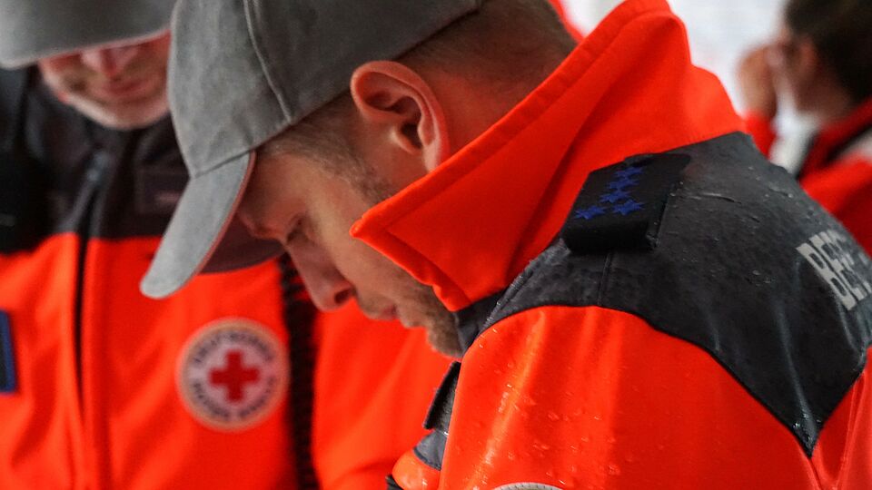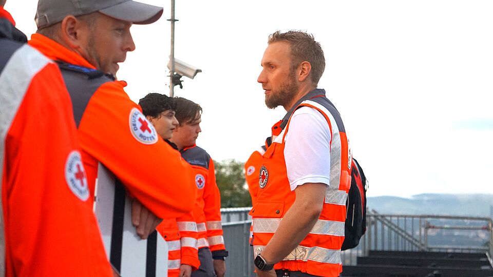 Es gießt in Strömen. Die Übung muss aus Sicherheitsgründen erstmal unterbrochen werden. Kein Drama, die Laune im Team ist trotzdem bestens. Deutlich zu spüren: Alle sind motiviert, freuen sich auf die Übung. Das Szenario: Während eines Tennisspiels muss ein Patient von einer vollen Zuschauertribüne gerettet werden.