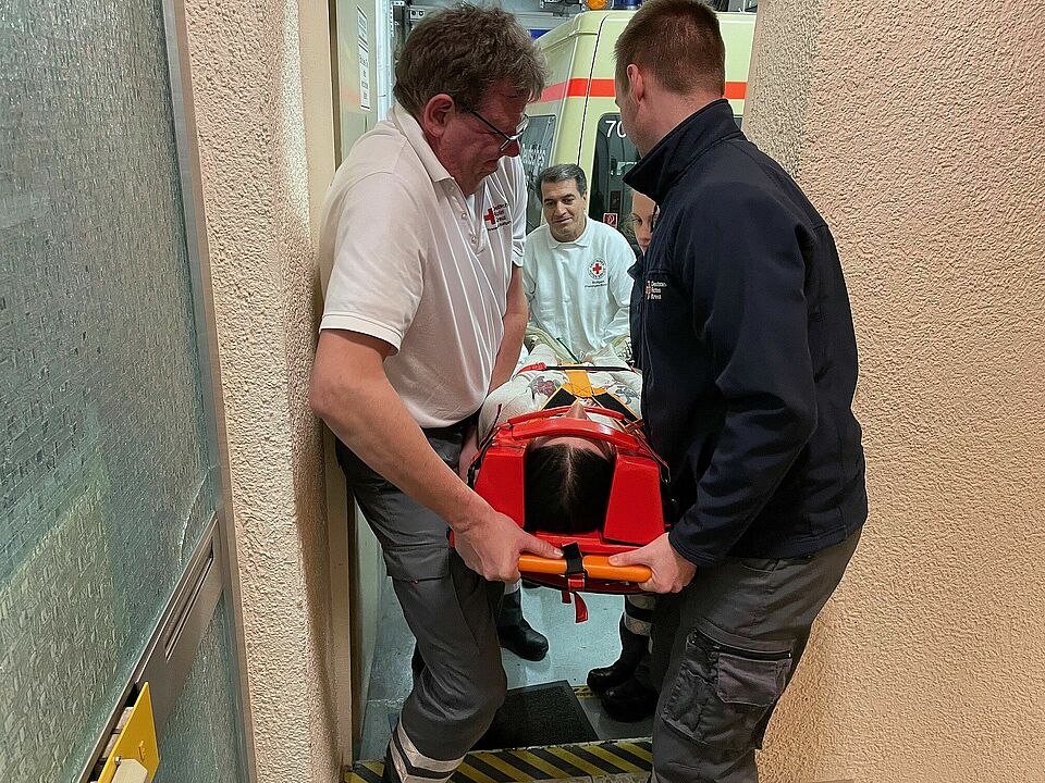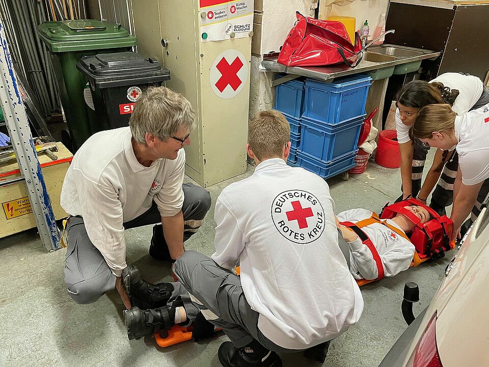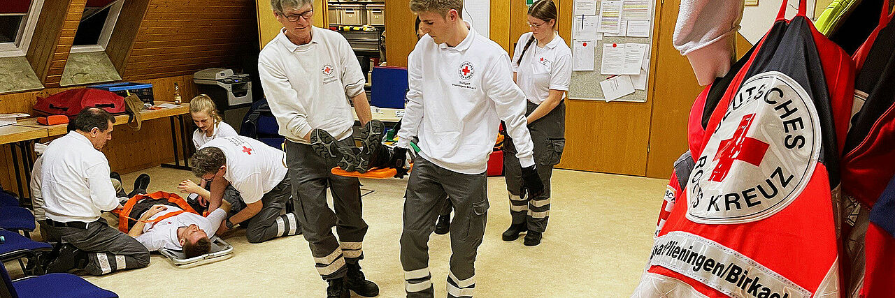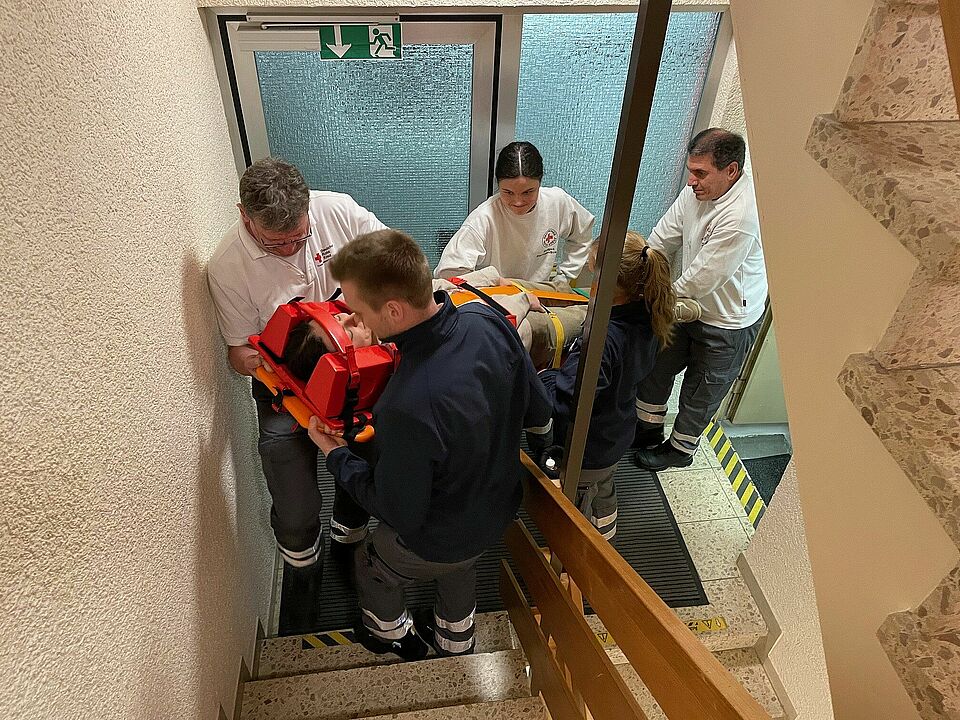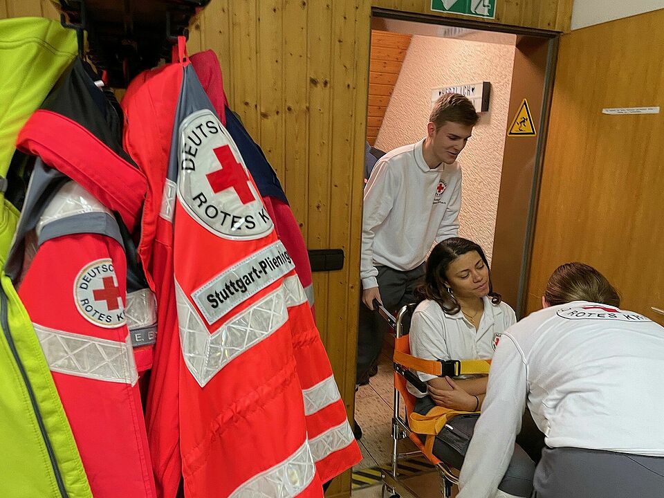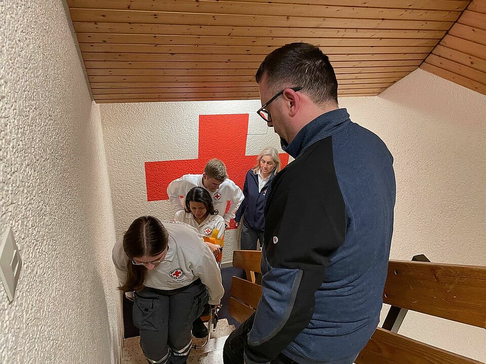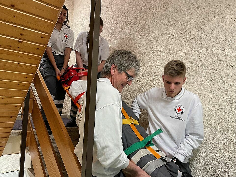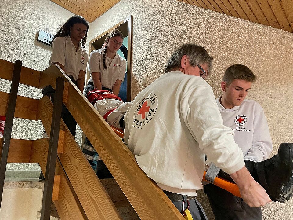 Mitten im alten Ortskern von Plieningen, dem südlichsten Stuttgarter Stadtbezirk, wo sich sonst keine andere sanitätsdienstliche Hilfsorganisation befindet, liegt es: Das Bereitschaftsheim des DRK Plieningen/Birkach, wo dieses Jahr 60. Gründungsjahr gefeiert wird. An diesem Mittwochabend steht beim Bereitschaftsabend für die ehrenamtlich aktiven Helferinnen und Helfer die Übung an: Wie transportiert man Verletzte durch ein enges Treppenhaus und über Hindernisse? Kniffliger Job, der im tatsächlich sehr engen Treppenhaus des Bereitschaftheims bestens geübt werden kann.