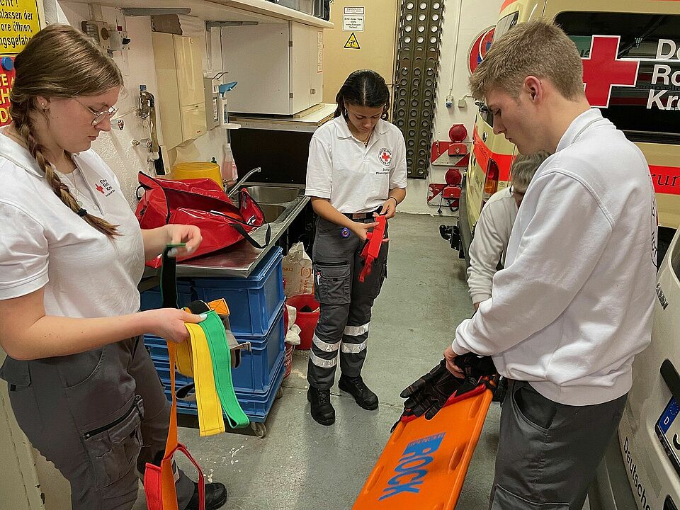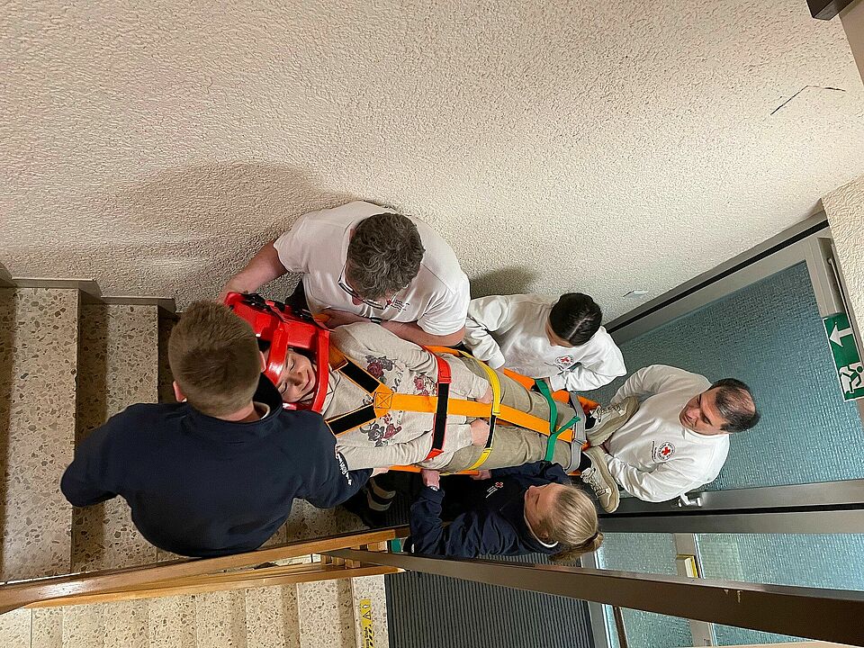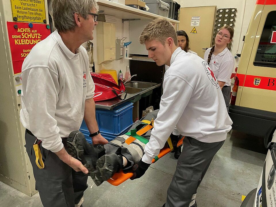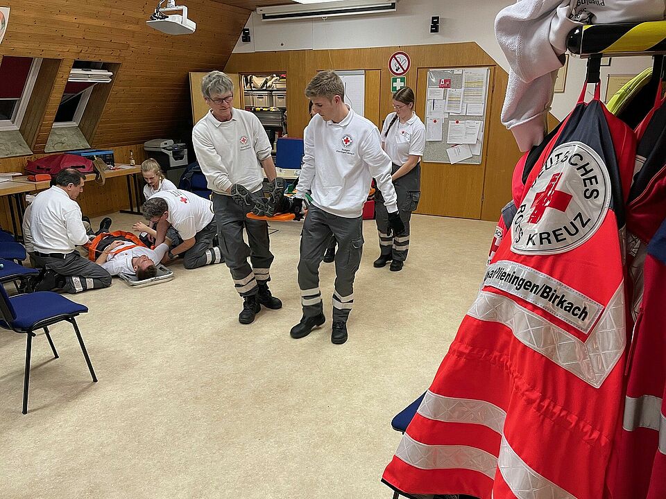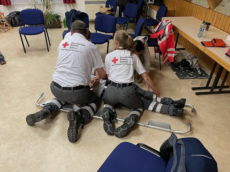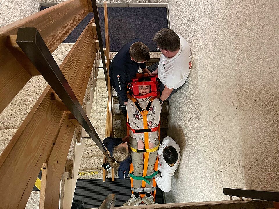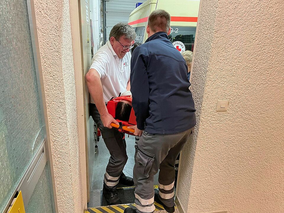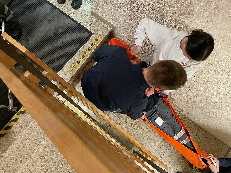 Was gibt's überhaupt für Transportmöglichkeiten, will Christian Fuchs von seinem Team wissen. Die Optionen sind schnell benannt und zusammengetragen: Tragering, Tragestuhl, Bergetuch, Spineboard, Schaufeltrage. In Dreierteams wird alles dem Praxistest unterzogen. Eine schweißtreibende Angelegenheit. Gleichzeitig wird viel gelacht, sind die Teams sichtbar mit Spaß und Leidenschaft bei der Sache.