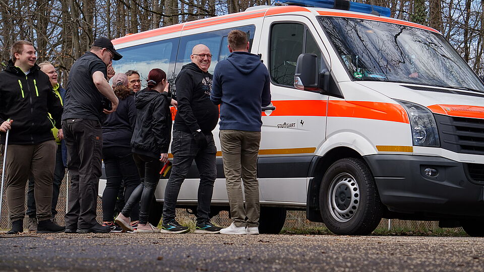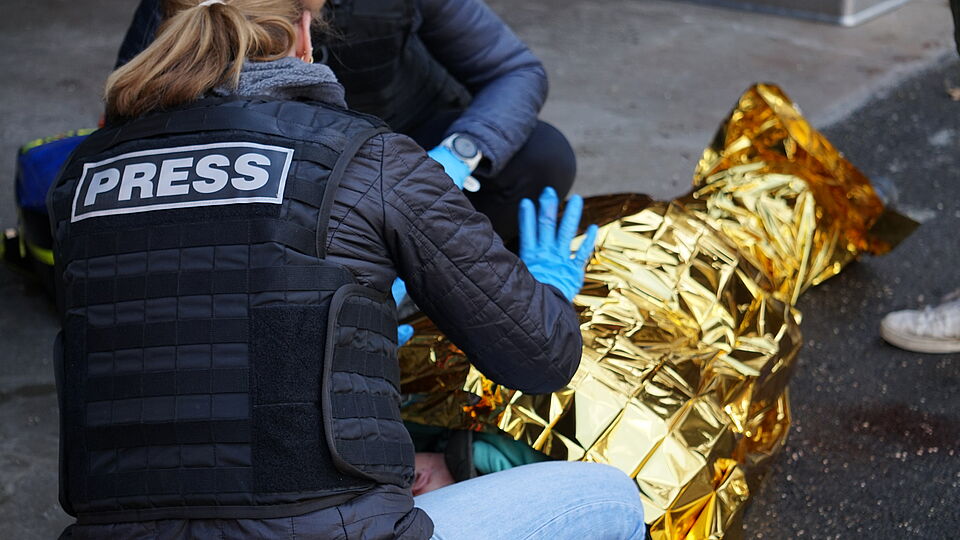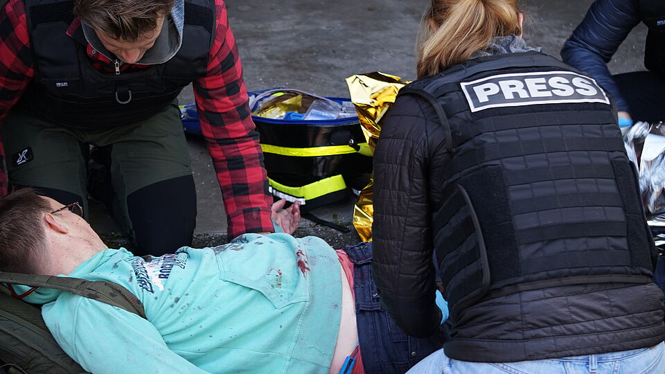 Sonnenschein, Waldidylle, Vogelgezwitscher rund um den Stuttgarter Fernsehturm - dann fallen Schüsse. Der Beifahrer im VW-Bus, in den gerade ein Presseteam eingestiegen ist, wird schwer verletzt, blutet stark. Zum Glück nur eine Übung im Rahmen des Erste-Hilfekurses “Extrem”, der Pressevertreter für Einsätze in Katastrophen- und Kriegsgebieten vorbereitet. Aber dank der Arbeiten des Teams Notfalldarstellung unheimlich realitätsnah. Das Blut spritzt nicht zu knapp.