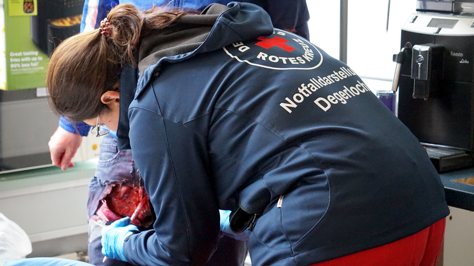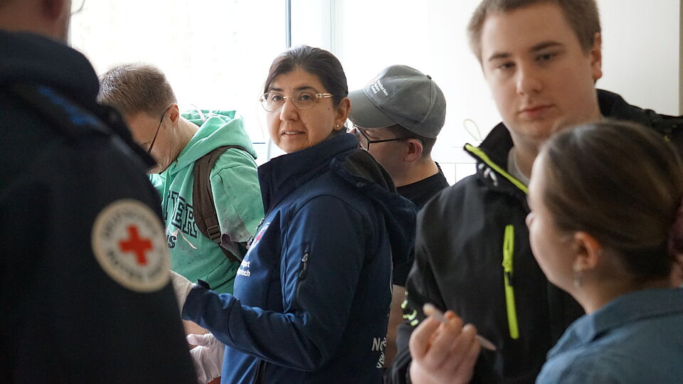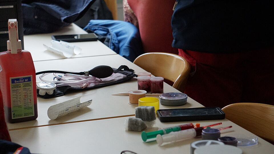 "Der saftet gleich richtig", hat Lisa vom Team der Notfalldarstellung bei den Vorbereitungen nüchtern festgestellt, als ihr Teamkollege aufwendig mit zahlreichen Schläuchen und Kunstblutbeuteln für seinen Mimeneinsatz präpariert wird. Rund eine Stunde, bevor der eigentliche Kurs startet, legt das Notfalldarstellungsteam los: schleppt die nötigen Materialkisten an, bespricht die darzustellenden Szenarien, schminkt die Mimen.