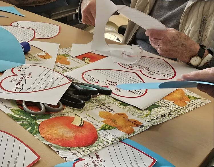 In einer gemeinsamen Bastelrunde haben Bewohnerinnen und Bewohner zusammen mit Mitarbeitenden bunte Herzen für den Herzenswunschbaum gestaltet. Mit viel Kreativität, Lachen und liebevollen Details sind kleine Kunstwerke entstanden, die nun darauf warten, Herzenswünsche sichtbar zu machen und den Baum mit Leben zu füllen.